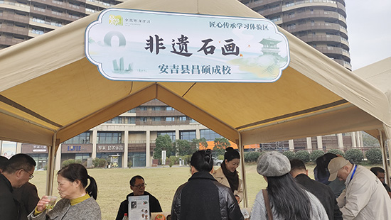 同時,昌碩成校申報的“非遺石畫”項目作為“浙江省終身學習品牌項目”,在主題體驗區設置互動展位。觀眾不僅欣賞到以天然石材為媒介、融合傳統工藝與當代審美的石畫作品,還親身體驗石畫制作過程,感受非遺文化在當代生活中的創新傳承。