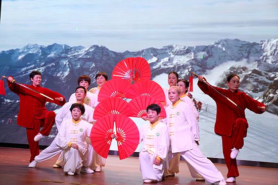 “朋友來了有好酒,若是那豺狼來了,迎接它的有獵槍”,在《我的祖國》伴奏下,太極劍扇合演則將濃濃的愛國情懷融合于劍的威猛與扇的飄逸中,剛?cè)岵g彰顯傳統(tǒng)武術(shù)的獨特魅力。