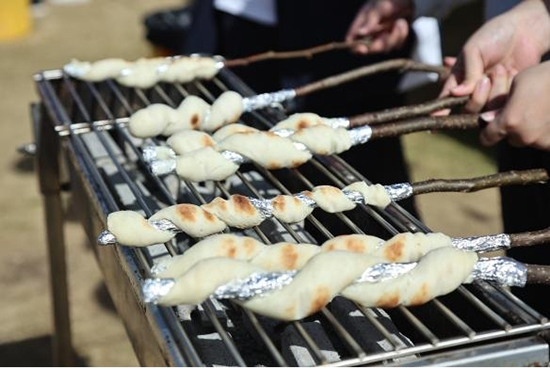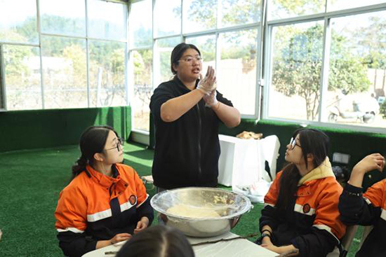 午餐時段,同學們走進梨樹林挑選枝條,親手將發酵面團制作成樹棍面包,現場烤制后品嘗自制的美味。大家在歡聲笑語中分享美食,進一步增進團隊默契,體會集體勞動的價值。