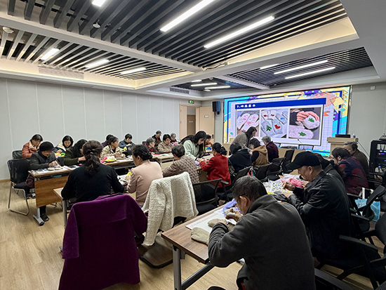 “阿姨們,要先抓出大概的羊毛量,再慢慢將羊毛用戳針戳刺出第一個造型,別一下子拿出太多,之后可以再拿一些羊毛繼續塑形,但大家要注意安全,帶上保護手指套,不要扎到手哦!”工作人員一邊巡視指導,一邊反復叮囑安全事項,耐心解答老人們遇到的問題。
