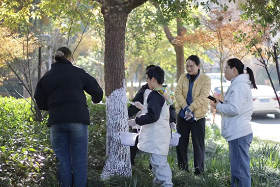實操環節中,孩子們在家長的陪伴與指導下,興致勃勃地為樹木 “穿新衣”:有的親子組合分工明確,家長測量樹干高度、調配涂白劑,孩子手持刷子細心涂刷;有的則相互協作,你遞工具我補涂,歡聲笑語中,一棵棵大樹逐漸穿上了整齊潔白的 “冬季新裝”,為安全越冬筑起了堅實的防線。親子間的默契配合、互助鼓勵,不僅讓護綠行動高效完成,更在勞動中拉近了心與心的距離,讓家庭氛圍愈發溫馨。