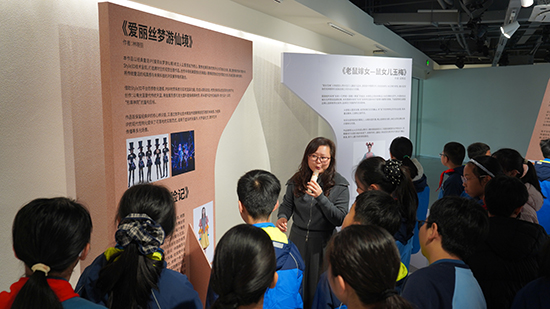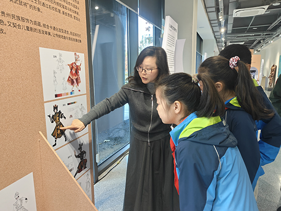 在上城區(qū)文化特派員張西琴的介紹下,孩子們的好奇心被徹底點燃。在《老鼠嫁女》展區(qū),大家圍著手稿追問苗族刺繡的寓意;看到《琵琶行》的服飾配色變化,有同學主動分享自己對詩句的理解。張西琴為孩子們搭建起通往專業(yè)藝術(shù)領(lǐng)域的橋梁,她結(jié)合展品細致拆解設計背后的文化內(nèi)涵與創(chuàng)作邏輯,讓孩子們讀懂蒙古族圖騰、唐代服飾形制如何與劇情深度融合,明白AI技術(shù)如何為傳統(tǒng)紋樣數(shù)字再生賦能。