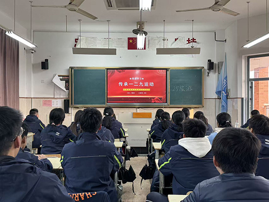在各團支部的主題團課上,班主任和團干部們化身“紅色講解員”,通過老照片、歷史紀錄片、情景講述等多種形式,生動再現了一二·九運動的壯闊歷程。為擴大活動覆蓋面,營造全員參與的濃厚氛圍,校團委聯合德育處開展“匠心筑夢 技能報國”主題宣講。校團委書記倪夢霞、校德育主任徐先鋒將一二·九運動的歷史意義與當代職校生的成長成才緊密結合,帶來了兩場有溫度、有深度的宣講。宣講結束后,全體師生莊嚴列隊,在領誓人學生會主席的帶領下,大家高舉右拳,字字鏗鏘:“銘記一二•九歷史,傳承愛國精神;錘煉專業技能,勇擔時代使命;勤學善思篤行,不負青春韶華;匠心筑夢強國,書寫復興華章!”激昂的誓言回蕩在校園上空,既是對革命先輩的致敬,更是職教青年矢志報國的堅定承諾。“一二·九運動的硝煙早已散盡,但‘愛國、進步、民主、科學’的精神永遠不會過時。”副校長劉著程在活動總結時強調:“作為職教青年,大家既要銘記歷史,更要立足當下——在實訓室里精益求精,在課堂上勤學善思,在志愿服務中傳遞溫暖,這就是對一二·九精神最好的傳承。”