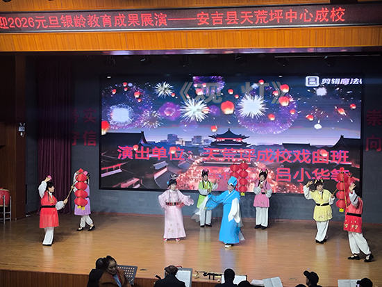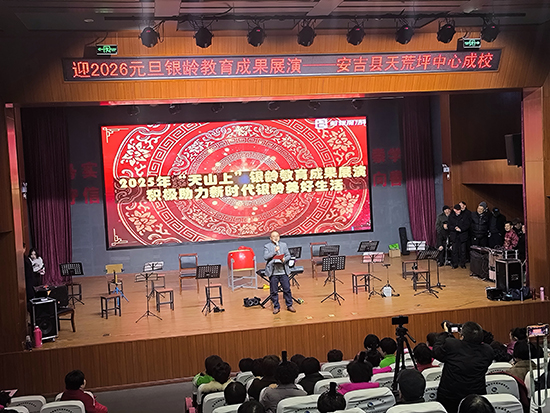 12月24日下午,安吉縣天荒坪鎮山河村文化禮堂內歡歌笑語、暖意融融,天荒坪中心成校“迎2026元旦銀齡教育成果展演”在此精彩上演。天荒坪中心成校及下屬上墅成校、山川成校的老年長班學員聯袂獻藝,近300名村民歡聚一堂,共賞這場充滿銀發活力的文化盛宴。