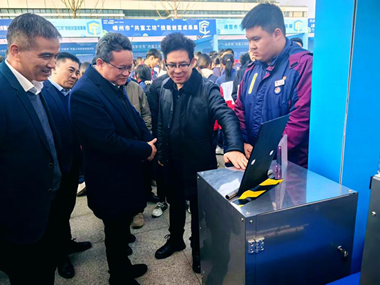 在學院展位前,領導一行駐足交流,詳細了解各項成果的研發與應用情況。學院黨委書記、院長高勇重點介紹了核心成果《恒壓變頻管件快速打磨機》,圍繞設備的三大創新亮點展開講解:其創新設計可靈活適配多種規格管件,保障加工一致性;通過封閉防護與回收裝置,實現環保與降噪雙重效益;借助智能控制系統,讓生產流程更精準高效。該設備投入市場后,在提升加工效率、優化產品合格率方面成效顯著,有效幫助企業降低生產成本,已在多家企業落地應用并獲得訂單。