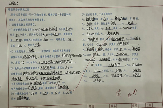 教師評語則成為師生溝通的“暖心橋梁”。有的評語側重鼓勵引導:“字很好,但要認真訂正!”有的注重方法指導:“計算思路清晰,建議對照計價規范再改進”;還有的結合專業特色給出個性化建議:“有創意,可融入綠色建材元素”。溫暖且專業的評語,既指出了問題不足,又給予了信心方向,有效激發了學生的學習動力。