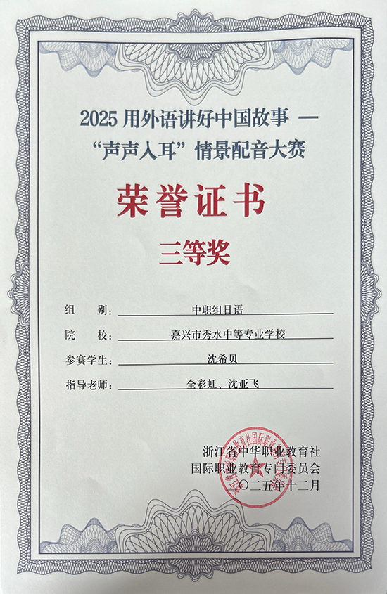 此次獲獎,是秀水中專長期堅持外語教學改革與跨文化育人成果的集中展現。同學們以扎實的語言功底、藝術感知與文化理解,在賽場上用自信的表達架起文明互鑒的青春橋梁。學校將繼續完善外語教學體系,拓寬實踐路徑,助力更多學子用外語向世界展現真實、立體、生動的當代中國。(俞爽爽)