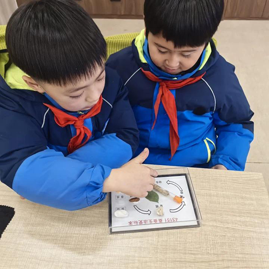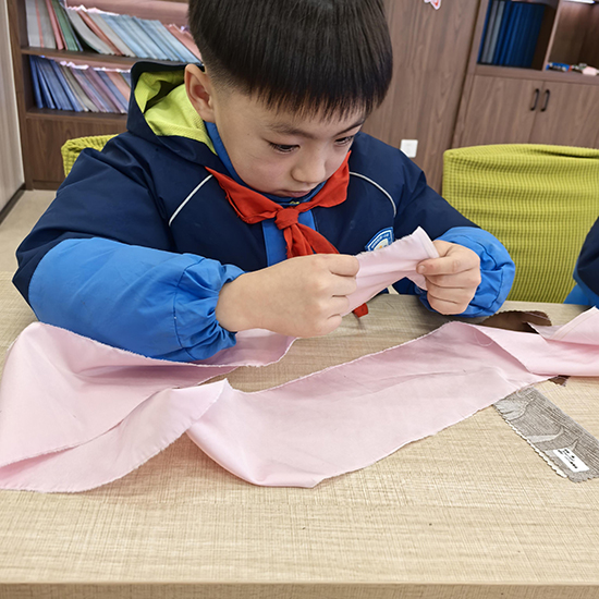 最讓孩子們興奮的,當(dāng)屬“絲綢七兄弟”觸摸體驗(yàn)環(huán)節(jié)。綾、綢、錦、紗、羅、緞、繡七種面料整齊陳列在課桌上,孩子們迫不及待地伸手觸摸,感受著綾的輕薄飄逸、錦的華麗精致、緞的柔滑細(xì)膩,不時發(fā)出陣陣驚喜的贊嘆。“原來絲綢有這么多種類,摸起來的感覺完全不一樣!”一位同學(xué)興奮地和同伴分享著自己的發(fā)現(xiàn)?;顒蝇F(xiàn)場,文化特派員還分發(fā)了蠶繭供孩子們觀察觸摸,捧著圓滾滾的蠶繭,孩子們圍在一起熱烈討論,好奇探尋著它蛻變?yōu)楣饣z綢的奧秘,一雙雙眼睛里滿是對傳統(tǒng)文化的向往。