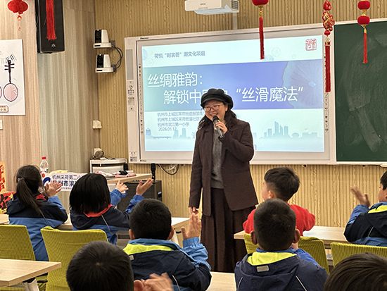 1月12日下午,杭州市濱江一小的教室里格外熱鬧,一場趣味盎然的絲綢文化進(jìn)校園活動在此圓滿開展。本次活動由來自杭州市上城區(qū)社區(qū)學(xué)院的上城區(qū)區(qū)文化特派員張西琴牽頭組織,特邀四季青面料市場黃新建擔(dān)任主講。這場“不務(wù)正業(yè)”的課堂之行,并非偶然之舉,而是采荷街道服裝街區(qū)產(chǎn)業(yè)社區(qū)“時裳薈”潮文化項(xiàng)目,深化政社校企協(xié)同共育機(jī)制的一次生動實(shí)踐。當(dāng)面料老板遇上童真課堂,當(dāng)產(chǎn)業(yè)資源牽手校園教育,傳統(tǒng)絲綢文化正以鮮活有趣的方式,在孩子們心中種下傳承的種子。