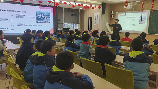 課堂上,黃新建化身專業(yè)的文化傳播者,從嫘祖養(yǎng)蠶的古老傳說娓娓道來,沿著絲綢起源的歷史脈絡(luò)徐徐展開,講到古絲綢之路的駝鈴聲聲,再延伸至絲綢在現(xiàn)代服飾、家居、文創(chuàng)等領(lǐng)域的多元用途。生動的講述搭配鮮活的案例,讓孩子們聽得津津有味,目光里滿是好奇。