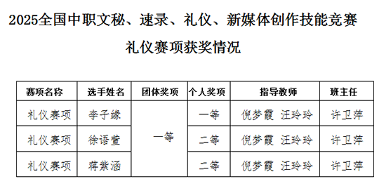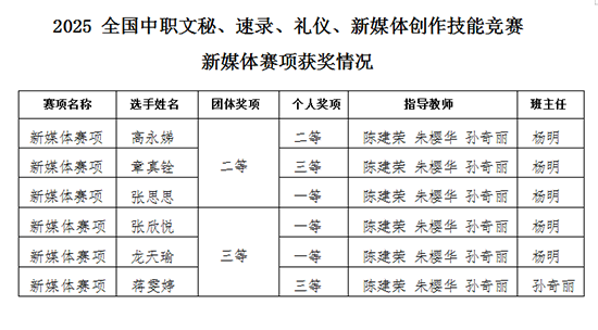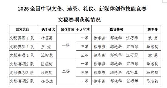 喜訊傳來(lái),捷報(bào)飛至!為期三天的2025全國(guó)中職文秘、速錄、禮儀、新媒體創(chuàng)作技能競(jìng)賽在浙江省桐鄉(xiāng)市衛(wèi)生學(xué)校圓滿收官。杭州市富陽(yáng)區(qū)職業(yè)教育中心學(xué)子憑借扎實(shí)的專業(yè)功底、出色的臨場(chǎng)發(fā)揮和卓越的綜合素養(yǎng),一路披荊斬棘,在全國(guó)300多名選手,16個(gè)團(tuán)體及個(gè)人比賽中,一舉斬獲9金7銀8銅的好成績(jī),用實(shí)力書(shū)寫了中職生的技能榮光。謹(jǐn)此,向所有獲獎(jiǎng)同學(xué)表示最熱烈的祝賀!向辛勤指導(dǎo)的老師們致以最崇高的敬意!向關(guān)心支持此項(xiàng)競(jìng)賽的領(lǐng)導(dǎo)們表示最誠(chéng)摯的感謝!