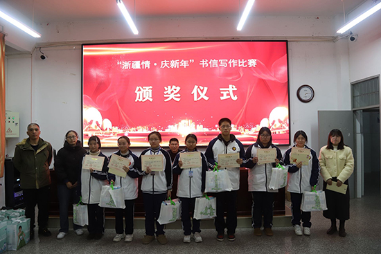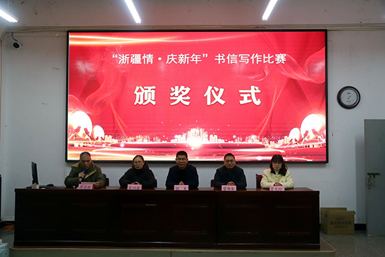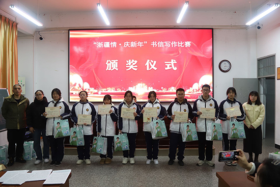 1月15日晚上,浙江省慶元縣職業高級中學階梯教室洋溢著溫馨熱烈的氛圍,“浙疆情,慶新年”兩校書信寫作比賽頒獎儀式在此隆重舉行。中國郵政慶元分公司總經理雷偉軍、慶元職高校長張發等嘉賓出席儀式并為獲獎者頒獎。