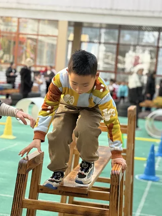 熱場表演落下帷幕,各項比賽輪番登場。大班的“‘繩’采飛揚”跳繩比賽中,小選手們手握跳繩快速躍動,繩影翻飛間,是速度與耐力的比拼,更是成長與突破的見證,賽場紀(jì)錄被一次次刷新;中班的“爭分奪秒”拍球挑戰(zhàn)賽火熱開啟,一分鐘內(nèi),籃球在孩子們手中上下翻飛,專注的眼神、穩(wěn)健的節(jié)奏,展現(xiàn)著協(xié)調(diào)能力與堅持精神;小班的“極速賽跑”充滿童趣,15米的賽道上,萌娃們奮力沖刺,每一步奔跑都凝聚著勇氣,每一次抵達都洋溢著喜悅。幼兒團體賽“超級障礙賽”更是將活動推向高潮,比賽結(jié)合幼兒園“原色動動動”特色項目,融合跑、跳、攀、鉆等多種動作,孩子們相互協(xié)作、奮勇闖關(guān),在鍛煉肢體協(xié)調(diào)性與靈活性的同時,也深深體會到了集體榮譽感與團隊合作的意義。