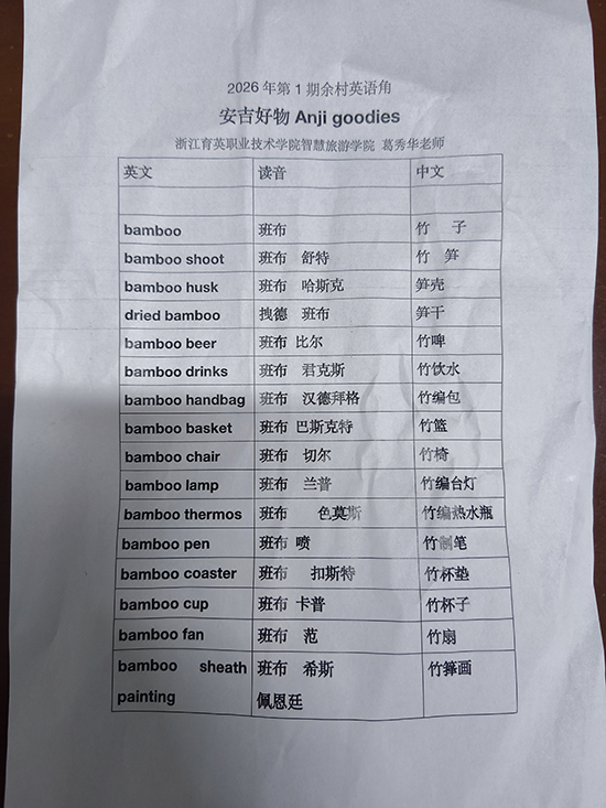 1月26日,天荒坪鎮(zhèn)余村文化禮堂內(nèi)氣氛熱烈,安吉社區(qū)教育學(xué)院天荒坪分院(天荒坪成校)“大余村共富課堂——余村英語角夜校”2026年第一期培訓(xùn)活動(dòng)在此拉開帷幕。浙江育英職業(yè)技術(shù)學(xué)院旅游管理專業(yè)外國語言文學(xué)副教授葛秀華受邀主講,為近20名村民及商戶帶來了一場實(shí)用又生動(dòng)的英語“充電”課。