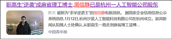 曾被《人民日報》點贊的“逆襲王”、溫州市龍灣區職業技術學校畢業生周信靜,近期再傳重磅消息——周信靜作為股東的杭州汐藍人工智能科技有限公司正式成立,這位從職高走出的MIT博士,如今躬身入局人工智能創業賽道。