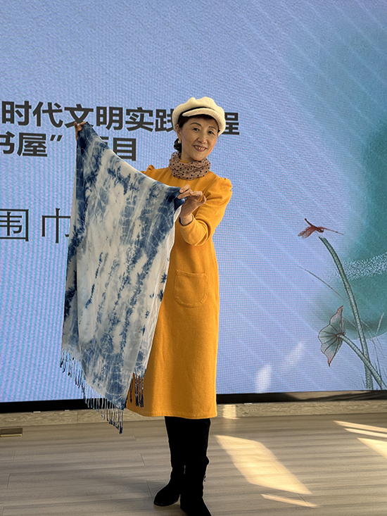 經過一段時間的浸染、氧化、清洗、拆解,原本潔白的圍巾逐漸顯現出獨一無二的花紋。每一幅作品都因捆扎的松緊、折疊的角度而迥然不同,深淺不一的藍色交織出暈染變幻、質樸靈動的藝術效果??吹阶约河H手制作的圍巾驚艷亮相,居民們的臉上洋溢著自豪與喜悅的笑容。李阿姨舉著作品高興地說:“沒想到我也能做出這么漂亮的圍巾!過程有趣,結果驚喜,回家就圍上!”