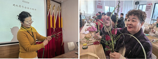 1月的非遺花藝體驗(yàn)活動(dòng)同樣精彩紛呈。非遺老師邢晗從中國傳統(tǒng)插花三千余年的歷史源流切入,詳解其“自然美、意境美、線條美、整體美”的核心特質(zhì)與“起把宜緊,瓶口宜清”的古法技藝。結(jié)合社區(qū)空港特色與居家生活場(chǎng)景,老師引導(dǎo)居民將生活感悟融入創(chuàng)作,玫瑰、菖蒲、南天竹等時(shí)令花材在大家手中煥發(fā)生機(jī),一件件獨(dú)具韻味的花藝作品相繼誕生。居民在修剪搭配中體會(huì)美學(xué)真諦,在相互欣賞中增進(jìn)情誼,讓花藝美學(xué)真正走進(jìn)生活。