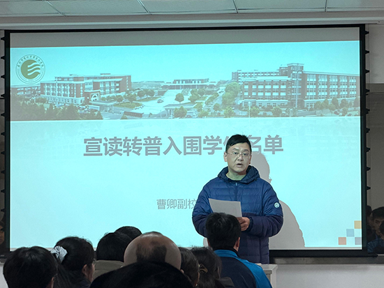 會議伊始,秀水中專副校長曹卿介紹了2025級職普融通班學生轉普程序,并宣讀轉普入圍學生名單。這30名學生在2026年1月的嘉興市普通高中期末統考中,達到轉入秀水高級中學的既定標準。名單宣讀完畢后,現場響起掌聲。