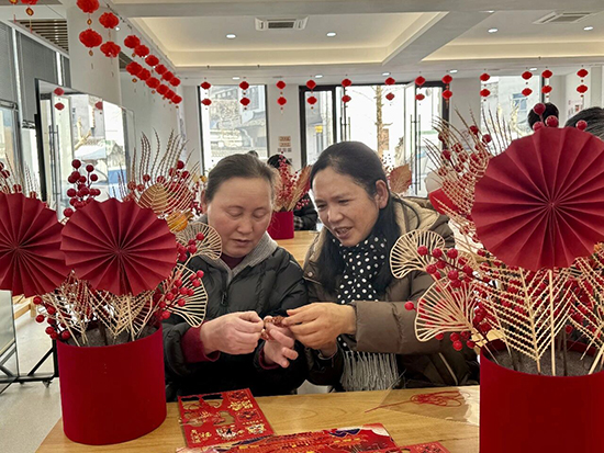 “大福桶DIY”將活動推向高潮。在工作人員的細致示范下,大家精心挑選紅果、銀杏、福卡、掛飾等材料,親手制作寓意“福氣滿桶”“紅運當頭”的新春福桶。現場氣氛熱烈,大家互相交流插配技巧,齊心協力將一只只福桶裝點得紅紅火火、獨具特色。指尖流轉間,一件件年味濃郁、匠心獨具的作品陸續完成。這不僅是一場生動的手工創作,更是一次沉浸式的新春文化體驗,老人們在專注創作與友好協作中,真切感受親手創造美好的喜悅,讓對幸福生活的向往變得更加真切可感。