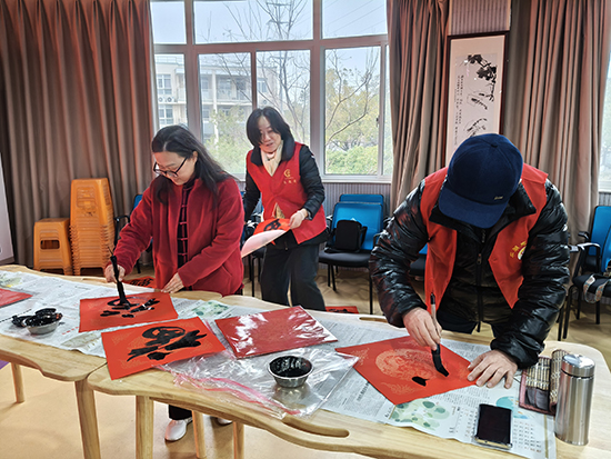 書(shū)法班、書(shū)畫(huà)創(chuàng)作班的十幾位學(xué)員于學(xué)期結(jié)束前,在龔國(guó)銘老師的帶領(lǐng)下,著手開(kāi)展寫(xiě)春聯(lián)活動(dòng)。自12月下旬開(kāi)始到2月中旬,共組織了近40場(chǎng)送福送春聯(lián)活動(dòng)。為機(jī)關(guān)、學(xué)校、銀行、老年公寓、鄉(xiāng)鎮(zhèn)、村、社區(qū)、殘聯(lián)、企業(yè)等共書(shū)寫(xiě)春聯(lián)3800多對(duì)、福字近5000個(gè)、迎春對(duì)聯(lián)軸300多軸、福牌和掛件1000多塊,為廣大市民送上真摯的新年問(wèn)候,以筆墨傳溫情、書(shū)香賀新春,傳遞美好祝愿。