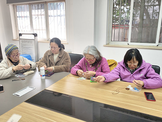 實操環(huán)節(jié)中,老師為每位居民分發(fā)了宋錦面料、金屬底托、掛繩、針線等全套材料,耐心演示了宋錦裁剪、包邊縫合、配飾搭配等制作步驟,從布料的折疊貼合到掛繩的固定調(diào)節(jié),每一個細節(jié)都細致講解、手把手指導(dǎo)。居民們聽得認真、學(xué)得投入,有的專注鉆研針法技巧,有的互相交流搭配創(chuàng)意,現(xiàn)場氛圍溫馨而熱烈。