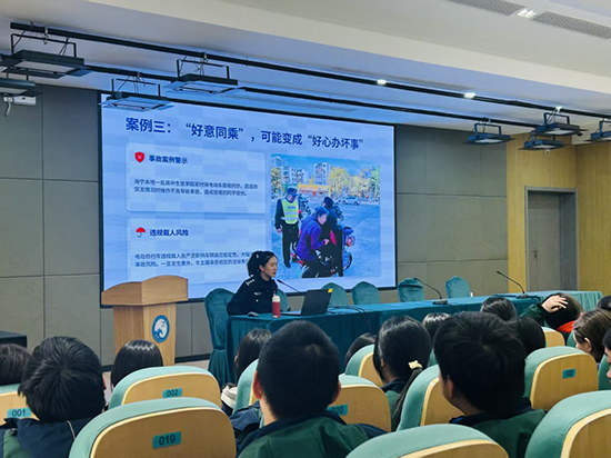 宣講現(xiàn)場,交警同志以本地電動車交通事故典型案例為切入點,通過視頻回放、圖片對比等形式,直觀呈現(xiàn)了超速行駛、逆向騎行、不佩戴安全頭盔、違規(guī)載人等違法行為的嚴(yán)重危害,用“身邊事”警醒“身邊人”,讓同學(xué)們深刻認(rèn)識到交通陋習(xí)背后的安全隱患。