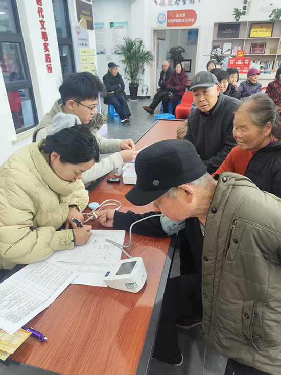 “潘醫生,我這最近總頭暈,您幫我看看”,82歲的李阿婆攥著病歷本,坐在中醫問診桌前。來自安吉中醫院天荒坪分院的潘凌霄醫生一邊搭著脈,一邊輕聲詢問飲食作息,末了在病歷上寫下注意事項:“您這是氣血不足,平時多吃點紅棗桂圓,記得按時測血壓”。醫護團隊的桌子前,測血壓、血糖的隊伍排起了長隊,志愿者們舉著號碼牌維持秩序,還貼心地給等候的老人遞上熱水。