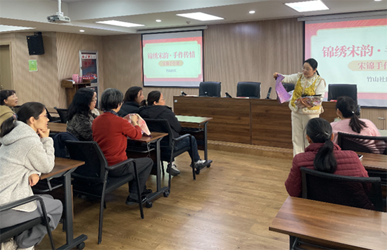 課堂之上,老師一邊講解宋錦的歷史淵源與工藝特點,一邊引導居民觸摸宋錦的經緯紋路,大家直觀感受著傳統紡織工藝的精湛與厚重,沉浸式體會非遺文化的獨特魅力。