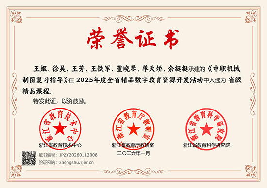 近日,由浙江省教育技術(shù)中心、浙江省教育廳教研室、浙江省教育科學(xué)研究院聯(lián)合組織的2025年度全省精品數(shù)字教育資源開(kāi)發(fā)活動(dòng)評(píng)選結(jié)果正式揭曉,由省特級(jí)教師王姬領(lǐng)銜,王姬名師工作室學(xué)科帶頭人徐吳、王芳、王鐵軍、董曉琴、單天嬌、余挺挺老師組建的教學(xué)團(tuán)隊(duì)申報(bào)的名師金課《中職機(jī)械制圖復(fù)習(xí)指導(dǎo)》,憑借優(yōu)質(zhì)的內(nèi)容設(shè)計(jì)、創(chuàng)新的教學(xué)模式及鮮明的職教特色,成功獲評(píng)省級(jí)精品課程,再添一項(xiàng)省級(jí)殊榮。